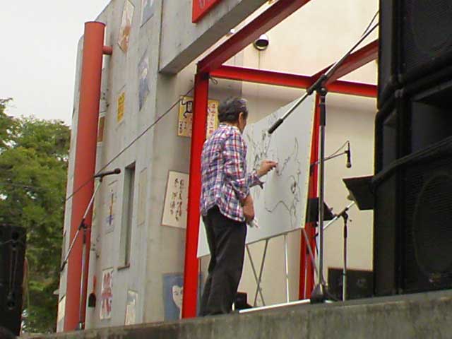 テントの向こうに見えるは宇野氏、編集関係の人?、九條今日子さん、カルメン・マキさん。