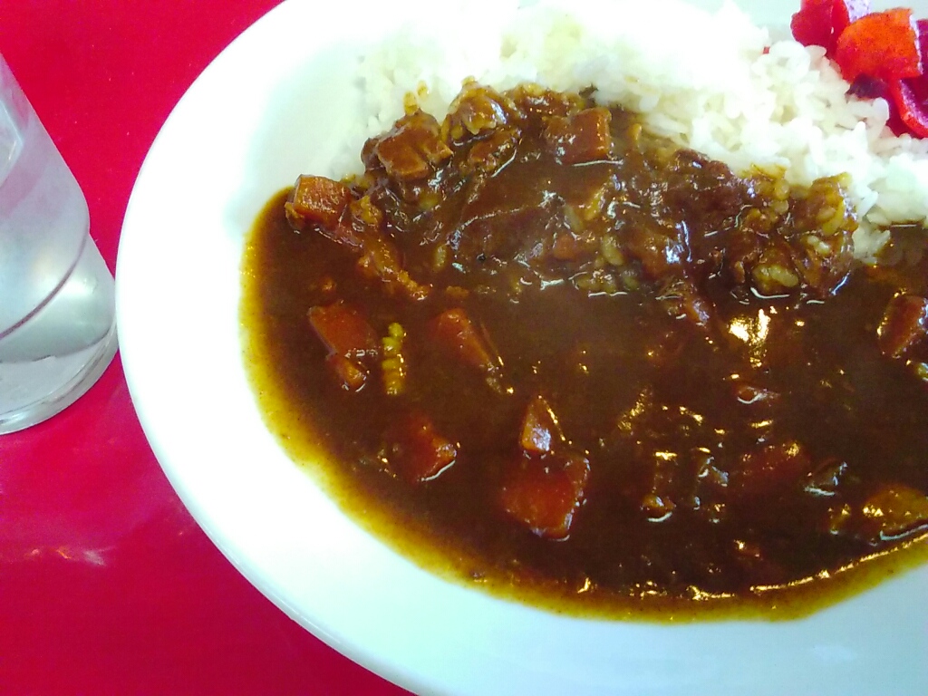 出てきたカレーはレトルトっぽいルーだったけど、肉わりと多め。具はほかにニンジン。