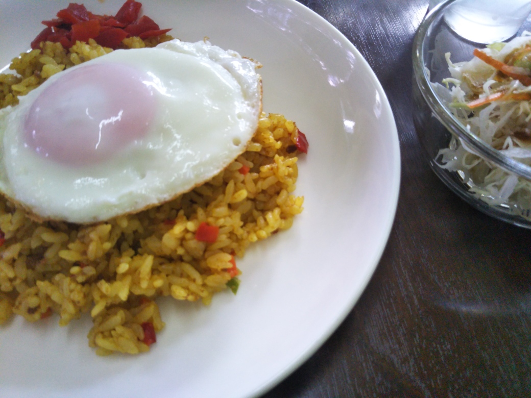 ワンコインランチの本持参で、ドライカレーとサラダ、アイスコーヒーをいただいた。