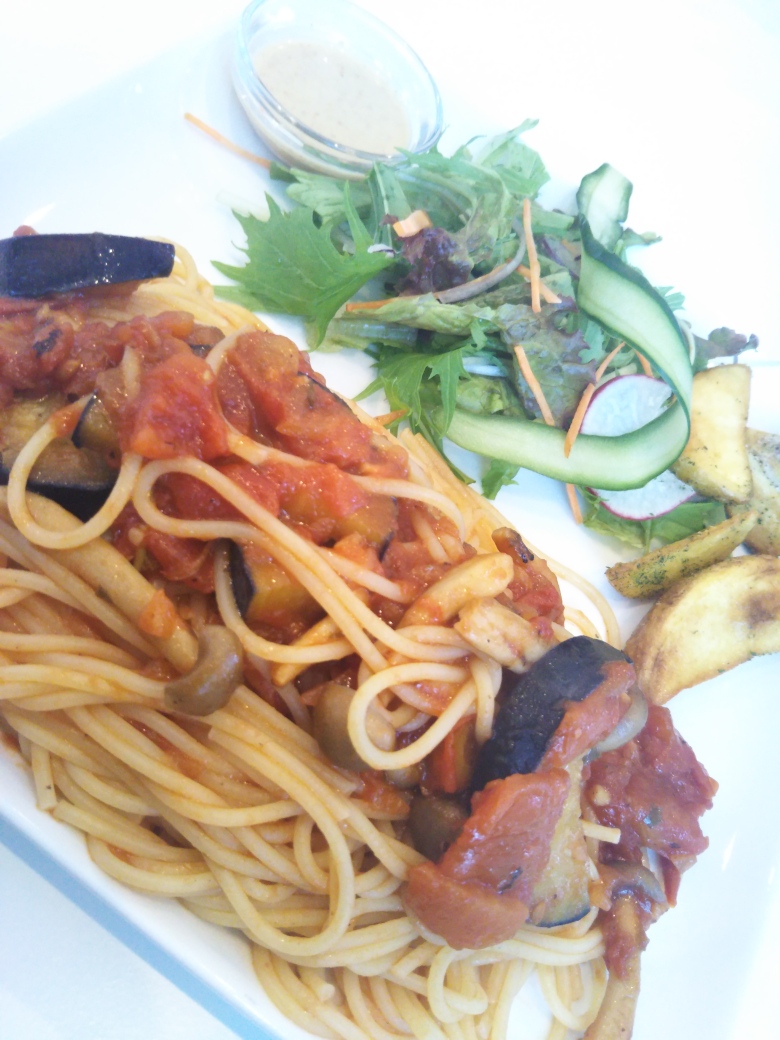 この日はワンコインランチの本持参で、パスタのプレートをオーダーしてみた。