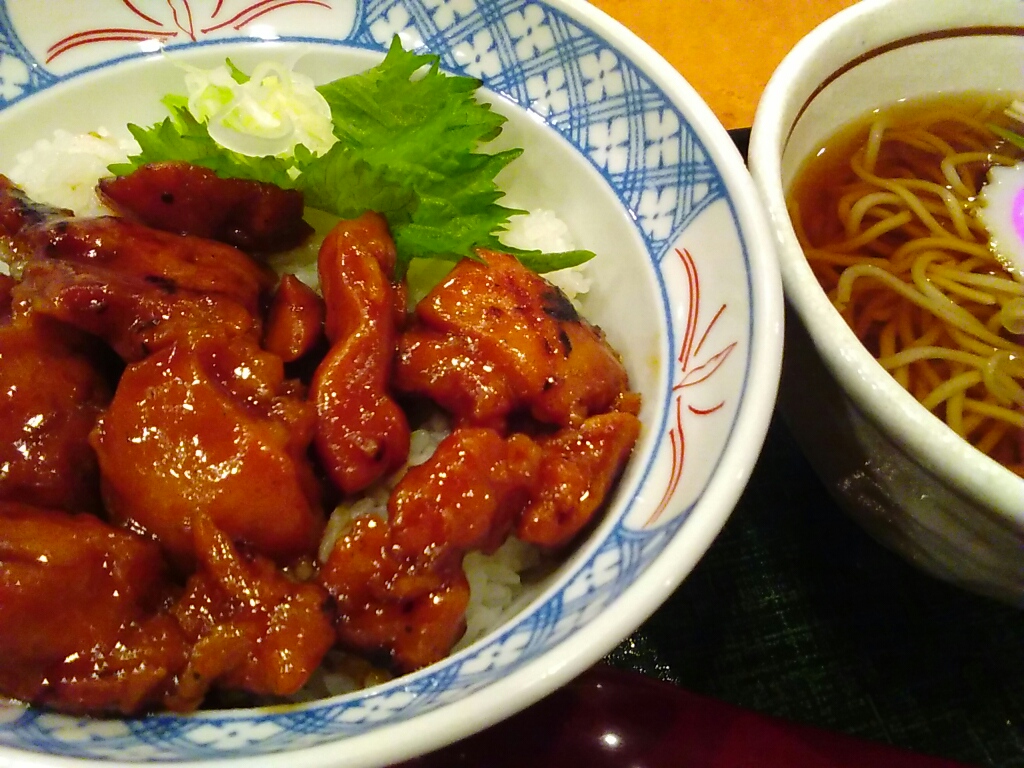 やきとりは甘辛だれでミニそばとの組み合わせもバッチグー(はい、死語です☆)。