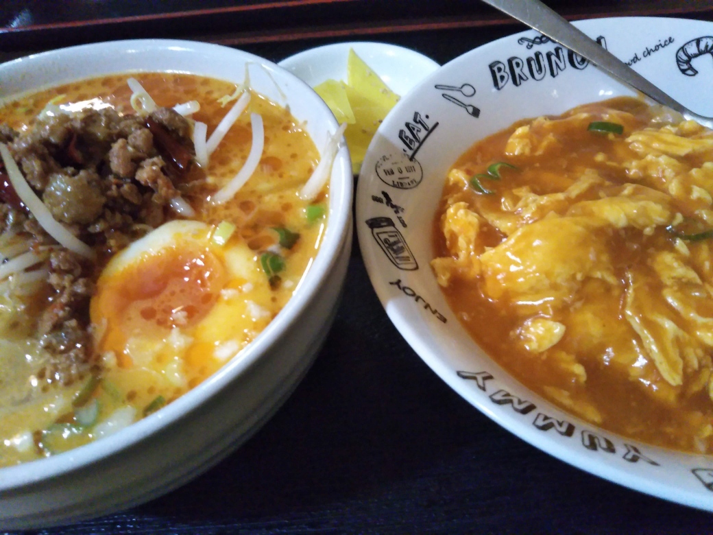 頼んだもの、四川担々麺とエビ玉子丼。850円也。