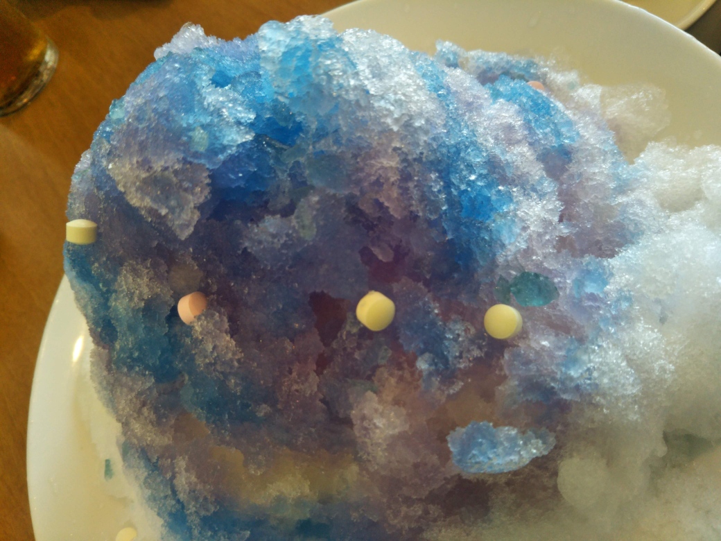 このかき氷、子どもの頃食べたお菓子「ドンパッチ」みたいに、口の中でラムネと思しきものがパチパチはじけた。