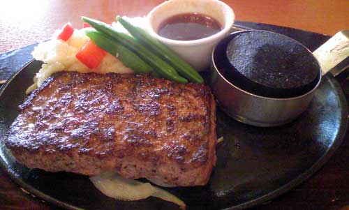 ハンバーグはアメリカ人がバーベキューで焼いてる(航空祭でよく見られる、あれ。あれよ!)のを想像してほしい。あんなかんじでビーフがジューシーでデリーシャスなかんじ。