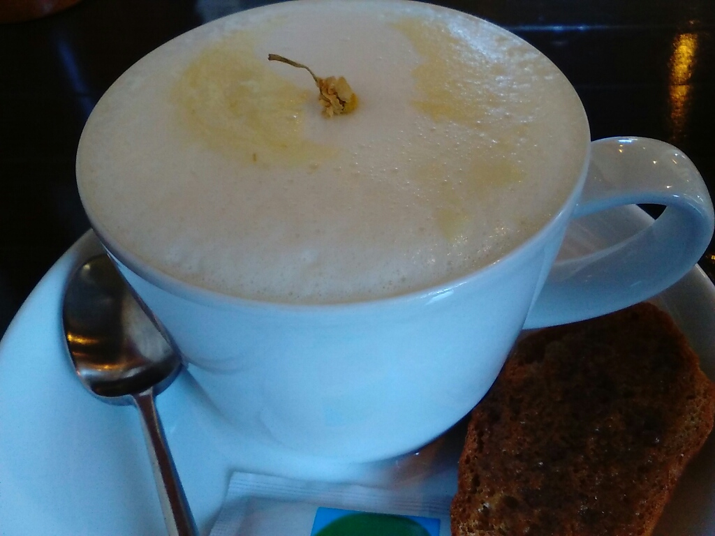 ドリンクは、カモミールオレをオーダー。カリッと香ばしいラスク付き。