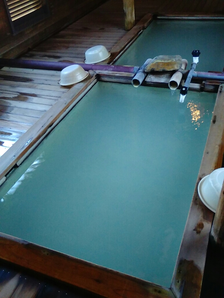 浴槽2つで、お湯がこぽこぽ。親切に、備え付けの洗面器あり。