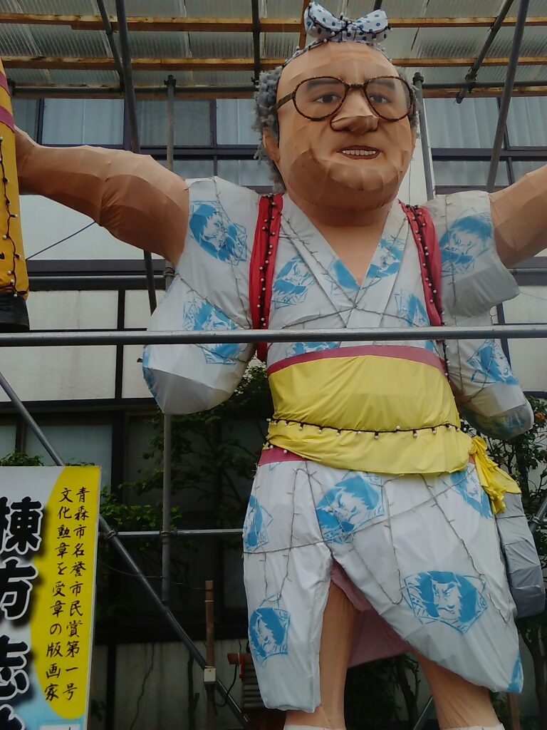 玄関脇には、ジャンボマックス・・・いや、巨大棟方志功ねぶた像がでーん、とお出迎え。