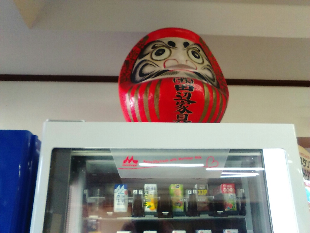 自販機の上から、謎のだるまがにらみ利かせてた。