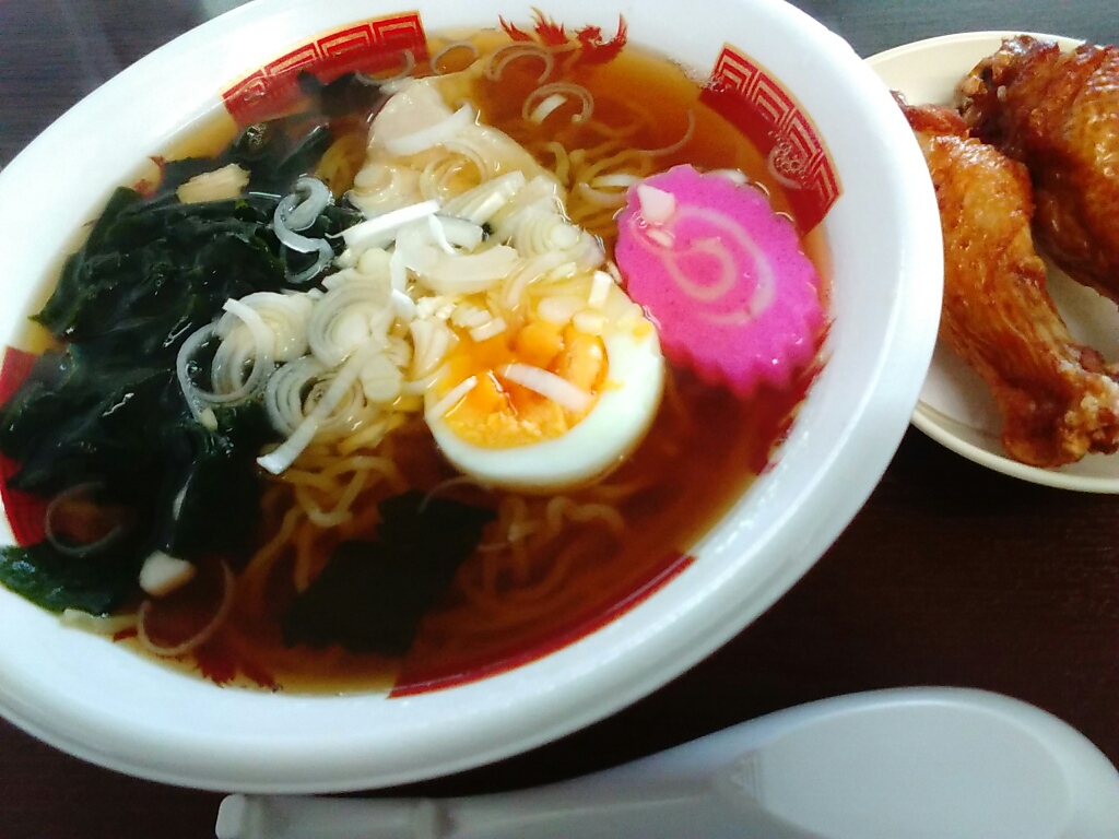 ラーメン、鶏のだしがきいてる。手羽、外側がぱりんとしてて中が柔らかい。