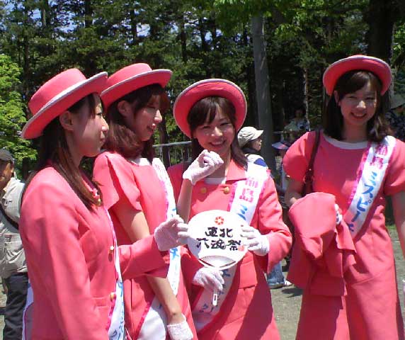ピンクのお召し物でたすき掛けの女性たちは、ミスさんさかしら?