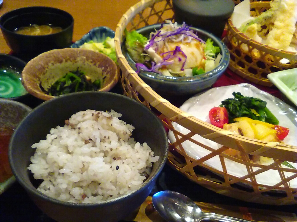 刺身三種、天ぷら盛り合わせ、鶏肉の柚子味噌マヨネーズ焼き、豆腐サラダ、小鉢、ご飯、茶碗蒸し、漬物。 どれもおいしー。この量でも余裕で完食できるぞ!!