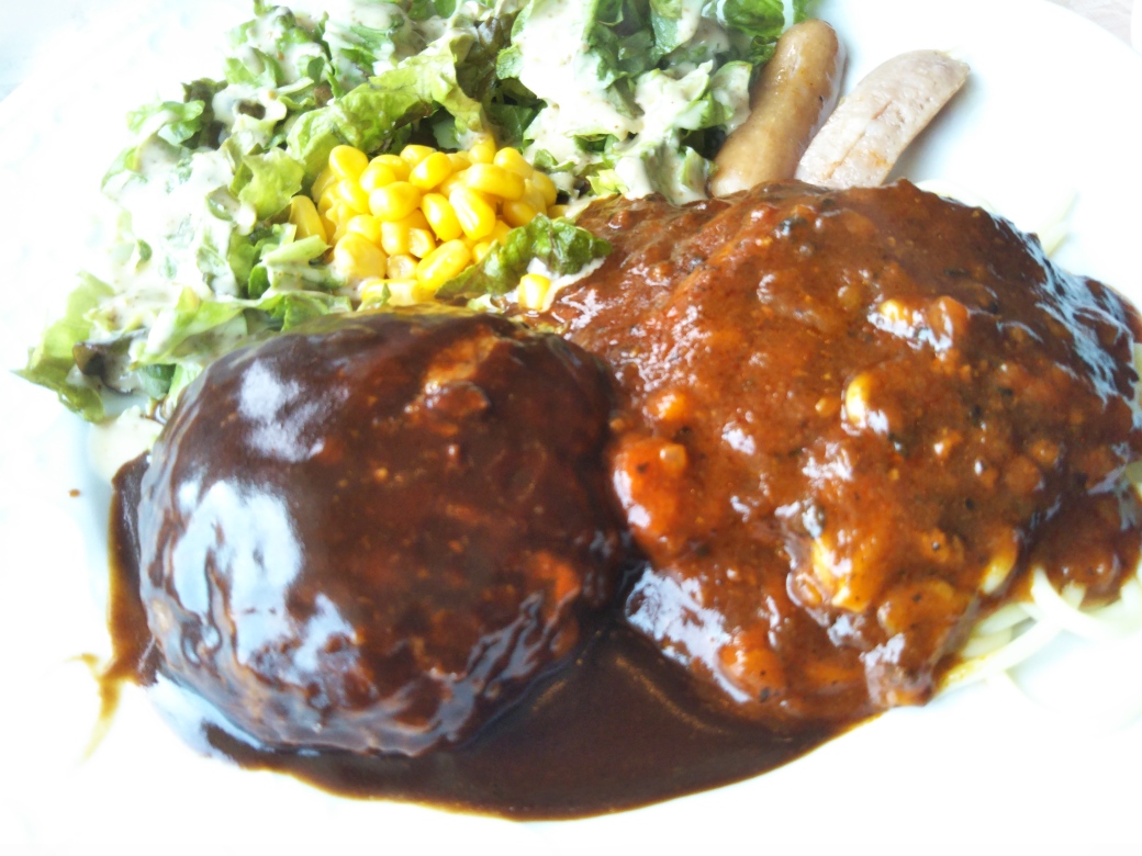 ハンバーグはふわふわ。ミートソースはデミグラスソースみたい。