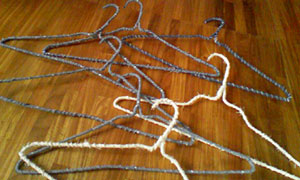 両面テープを貼った針金ハンガーに、1.5cm巾に切った布をぐるぐる巻きつけておわり。手芸というより、工作ってかんじ。