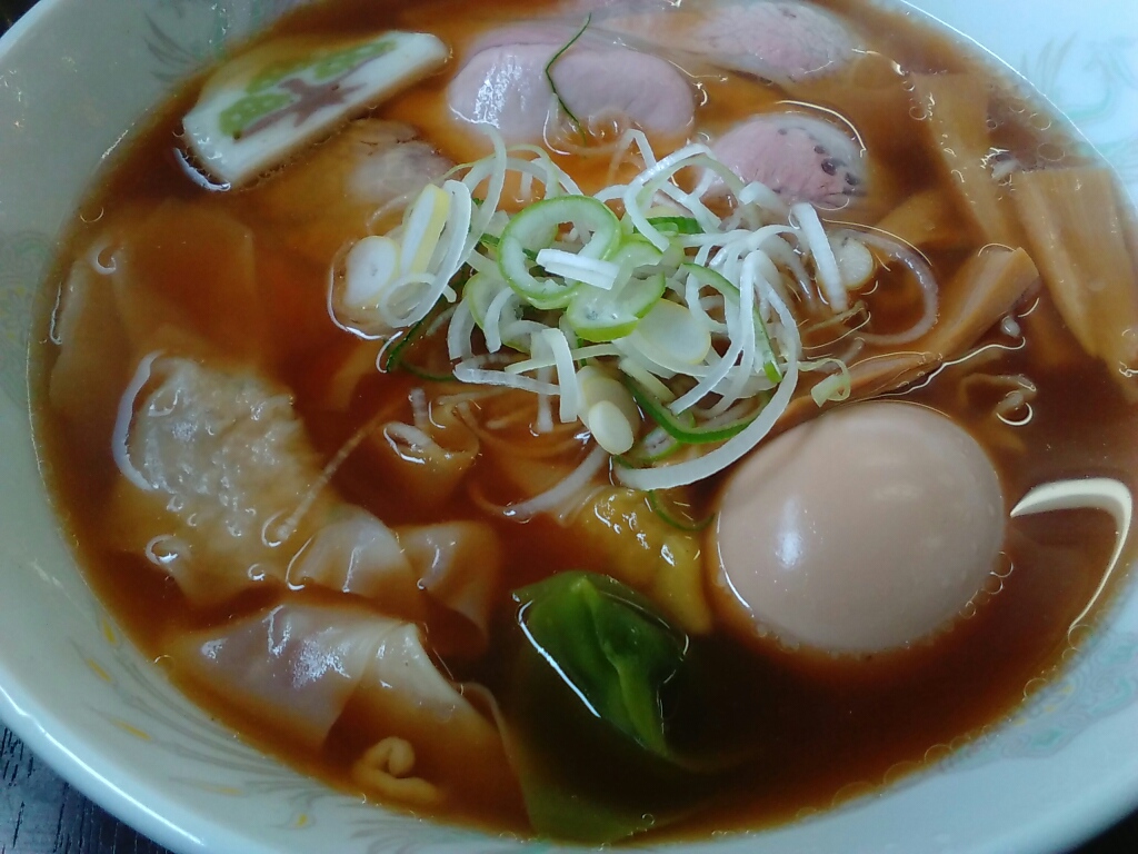 玉子にワンタン、チャーシューで具沢山の醤油ラーメンだ。