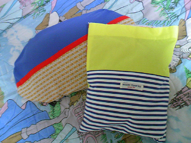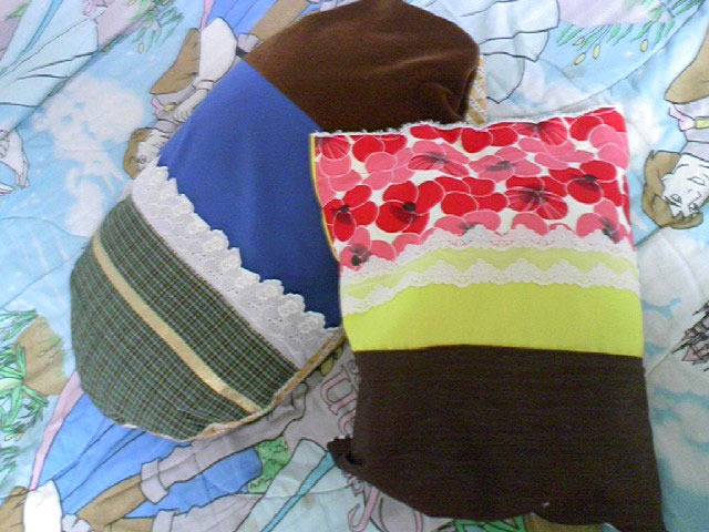 無印良品のへんな形のまくらと、佐藤製薬の景品かなにかでもらったビーズクッションにカバーをつけた。余り布を使って。