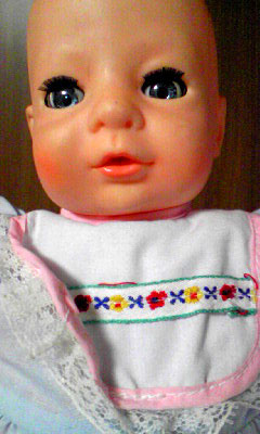 細眉、口紅の赤ちゃん。目はぱちくりしないタイプ。
