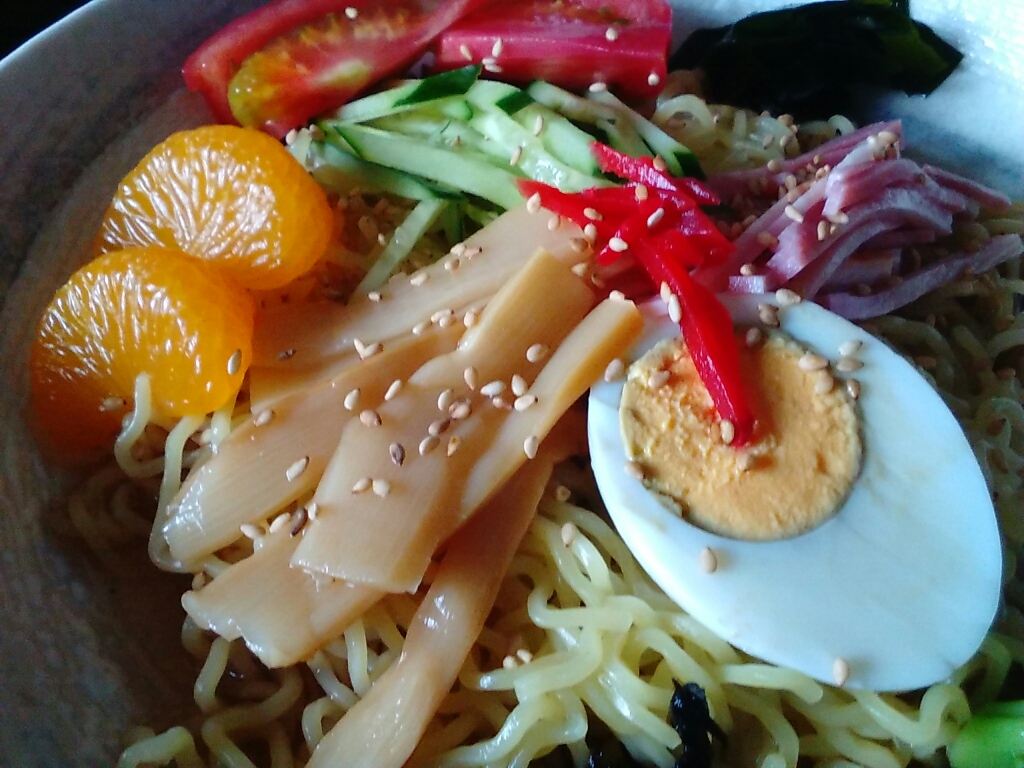 冷やし中華って錦糸卵なのかと勝手に決め込んでたが、ゆで卵もなかなか良いなぁ。
