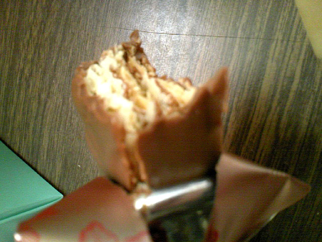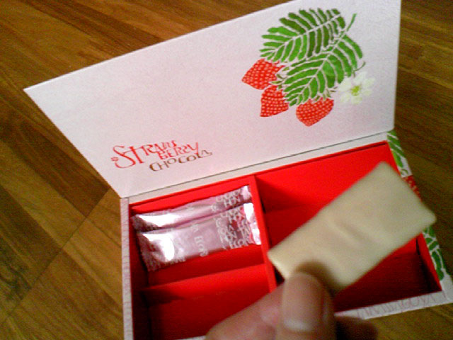 うすーいパリパリした生地(エコルセってやつ)にやさしいイチゴ味のチョコがコーティングしてある。イチゴ嫌いなおいらでも、こういう酸っぱくないイチゴ味のお菓子はオッケー。