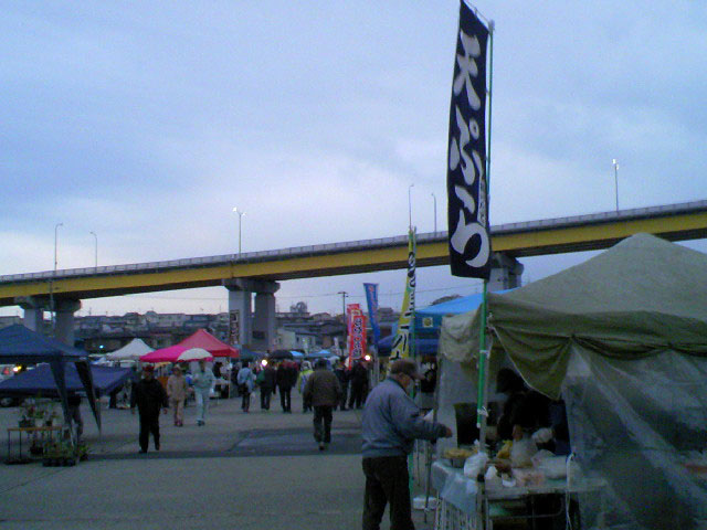 明け方からスタートなんてネットで紹介してあるもんだから、相当張り切ってやって来たもんだが、今まさに店のテント張るところだったり、鍋物煮出したり、焼き物焼きだしたり・・・