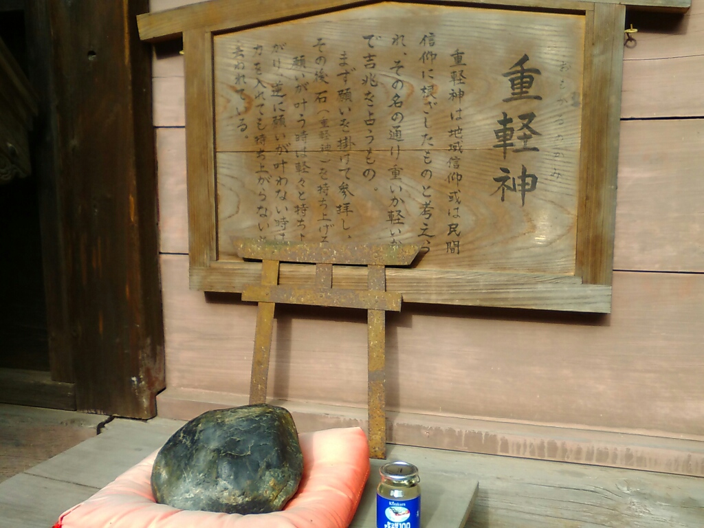 願いをこめて参拝し、この石(重軽神)を持ち上げてみて、それが重く感じたらその願いが叶わないんだって。