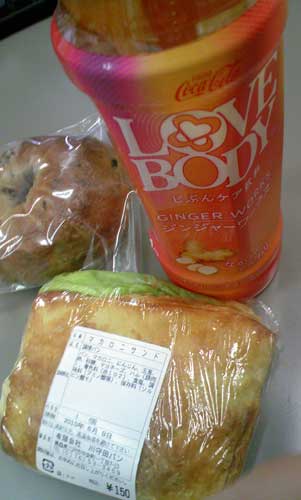 フツーの、いわゆるひとつのホットドックみたいなパン(バンズとは言わん!)に、マヨネーズが絶妙にからまったイモと焼きそばORスパゲティが挟まったやつ。ちなみに私は「スパ派」。