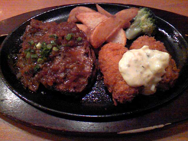 ハンバーグと牡蠣フライのセット、味つけちょいと濃い目だったがおいしかった。