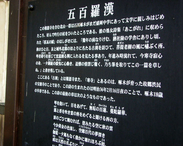 石川啄木がまだ盛岡中学の学生だったころ、級友とよくこの辺りを散策したといわれ、詩集「あこがれ」の中の「落瓦の賦」は報恩寺をうたったものらしい。