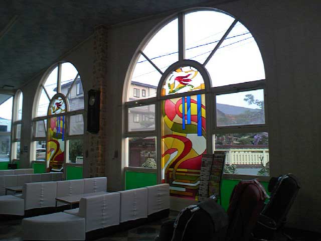 ロビーの窓ガラスがレトロでかわいい。