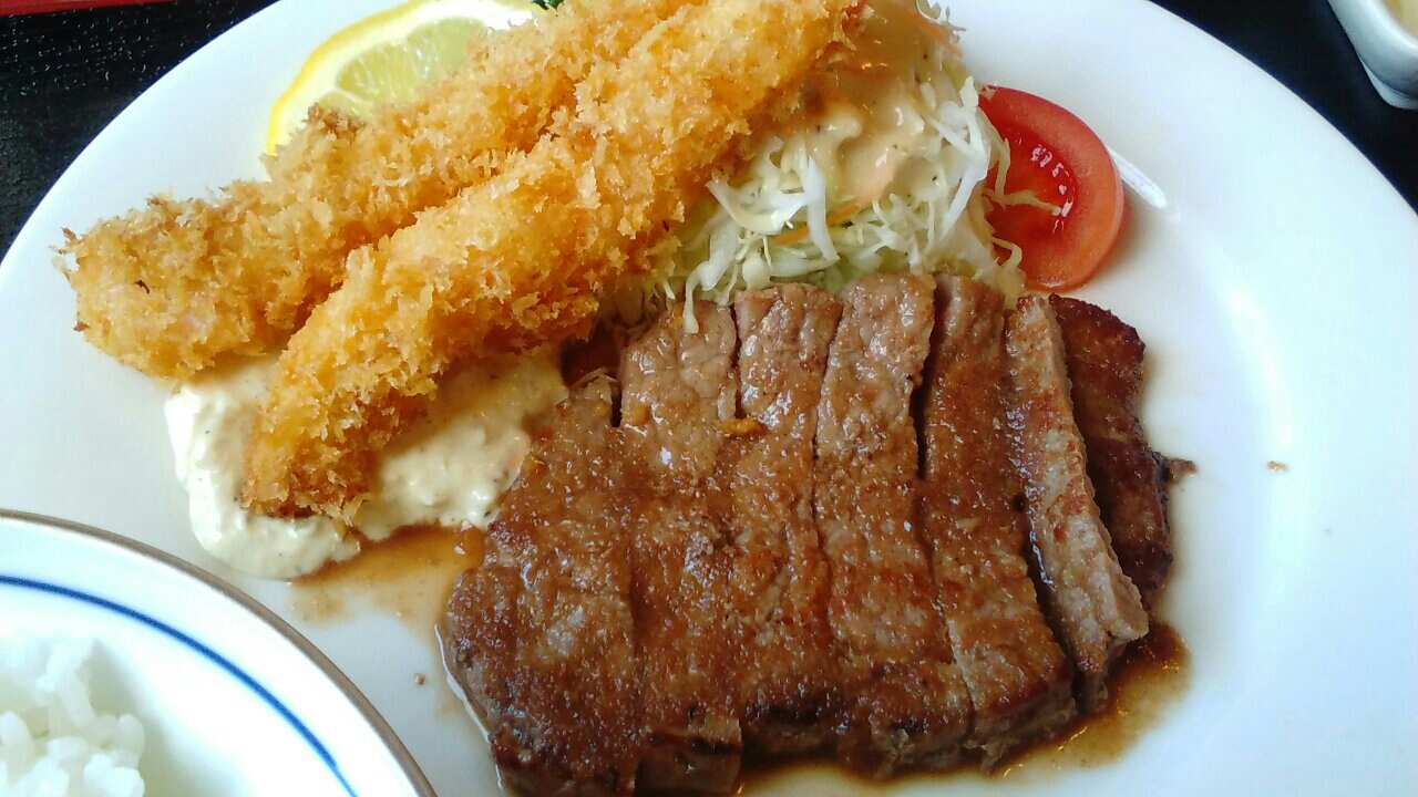 今回は「ステーキとエビフライ」の定食をオーダー。