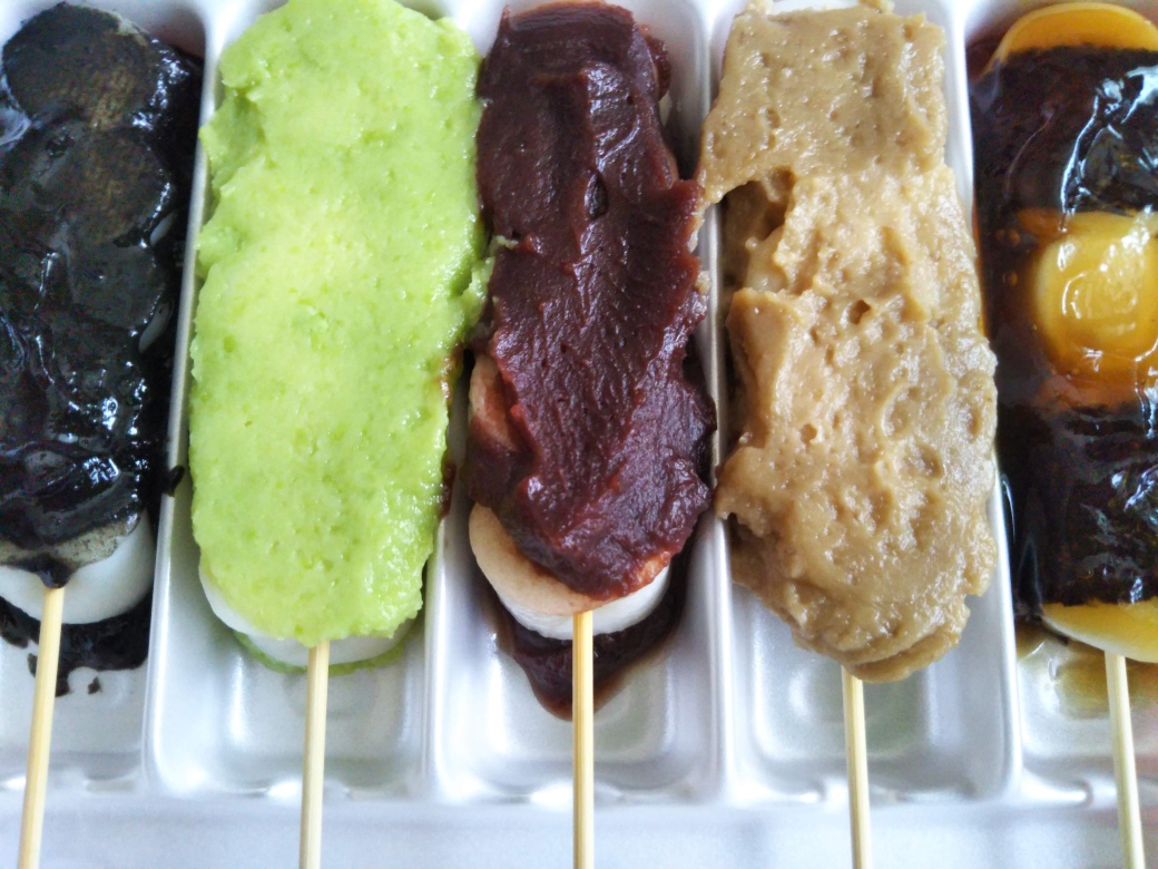 もちっとした食感のだんごにたっぷりの餡。5色がそれぞれにおいしい・・・(と思う)。