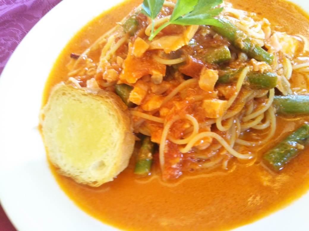 この日のメインはスモークサーモンとアスパラのトマトパスタ。