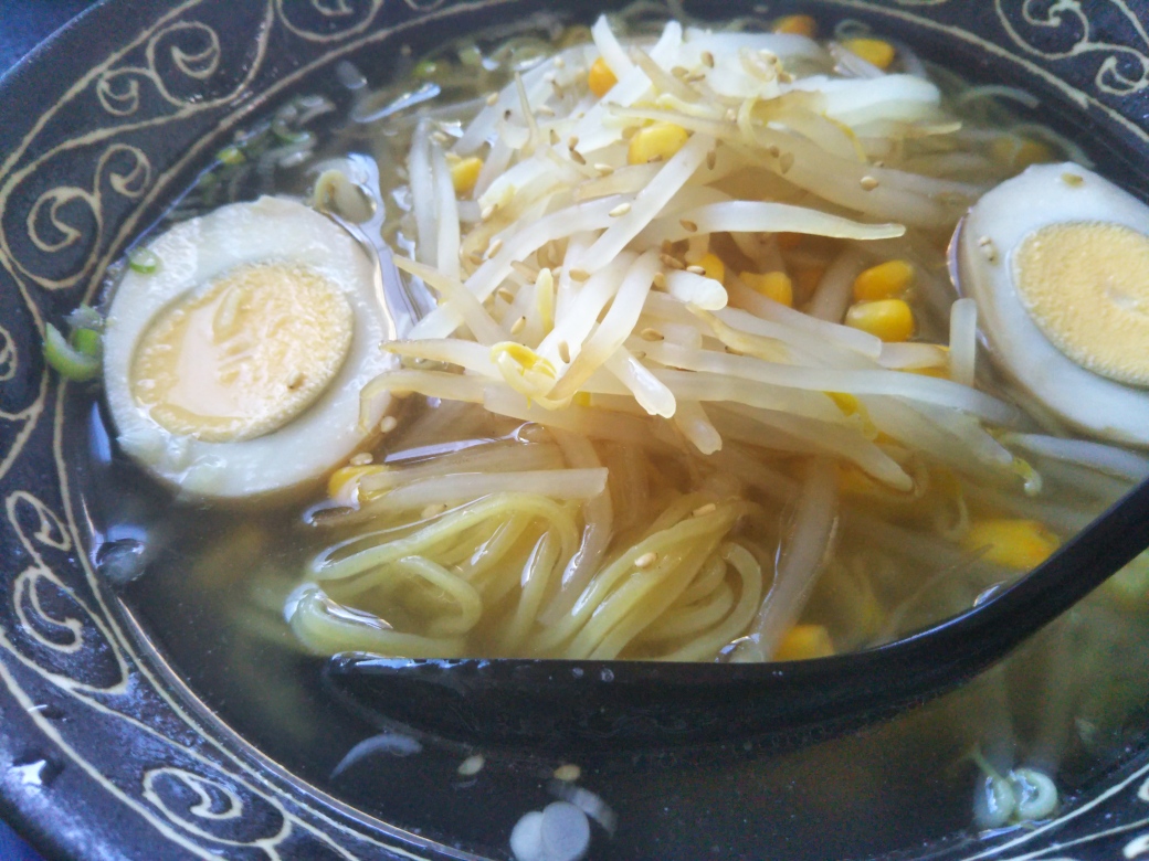 コーンともやしがたっぷりで、スープだけでも十分うまい。