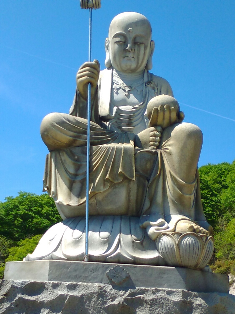 玄関脇には、ジャンボマックス・・・いや、巨大棟方志功ねぶた像がでーん、とお出迎え。